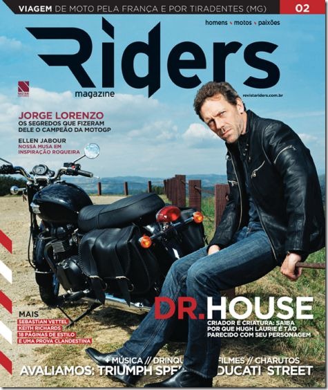 Nas duas primeiras edições, capas com celebridades pop. Bruce Willis (confesso, tive um comichão com essa capa) e Dr. House Hugh Laurie chamam atenção não só do público alvo como de outras pessoas, que comprariam a revista mesmo sem necessariamente gostar de motos. Ao mesmo tempo, é inegável que as capas são bacanas e capazes de gerar identificação com os motoqueiros. Ponto pra Riders.